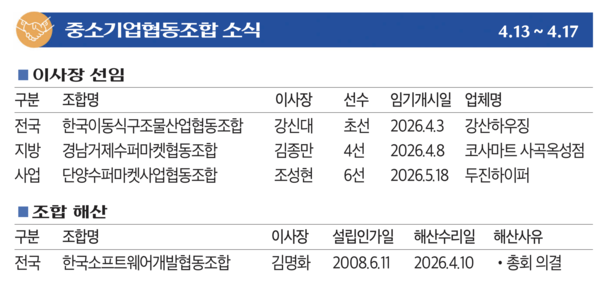 조합안내 설립·운영 지원사업 홍보관 알림마당 중소기업중앙회 노란우산 공제기금 중소기업 보증공제 파란우산 손해공제 PL단체보험 조합안내 중소기업협동조합 소개 소개 지원근거 기능 협동조합 검색 협동조합 통계 지원제도 소개 혜택안내 컨설팅 및 활성화 지원 설립·운영 설립안내 설립절차 설립컨설팅 안내 운영안내 운영컨설팅 안내 총회 이사회 임원관리 임원선거 정관규약·규정 제·개정 조합원관리 사업계획 및 수지예산 작성 회계 및 결산 세무 중앙회 회원가입 안내 산업·특별위원회 운영목적 및 기대효과 위원회 현황 지원사업 정부지원시책 현장에 닿는 정책! 2026년 중소기업 핵심사업 동시 안내 중소기업 지원사업 활용 중소기업 사업조정제도 조합 기능활성화 지원 지방자치단체 조례 임직원 교육 조합 활성화센터 입주 조합 공동사업 지원 공동사업SOS지원단 혁신형 공동사업 지원사업 공동구매 전용보증 전문인력 지원사업 판로지원 공공구매제도 참여 글로벌화 지원 기술개발지원 단체표준 제정 컨설팅 홍보관 협동조합 제품·서비스 공동사업 따라잡기 우수사례집 보기 중소기업협동조합 뉴스 알림마당 공지사항 자료실 운영자료 법령자료 동영상 자료실 온라인 고객상담 자주묻는질문 온라인상담 닫기